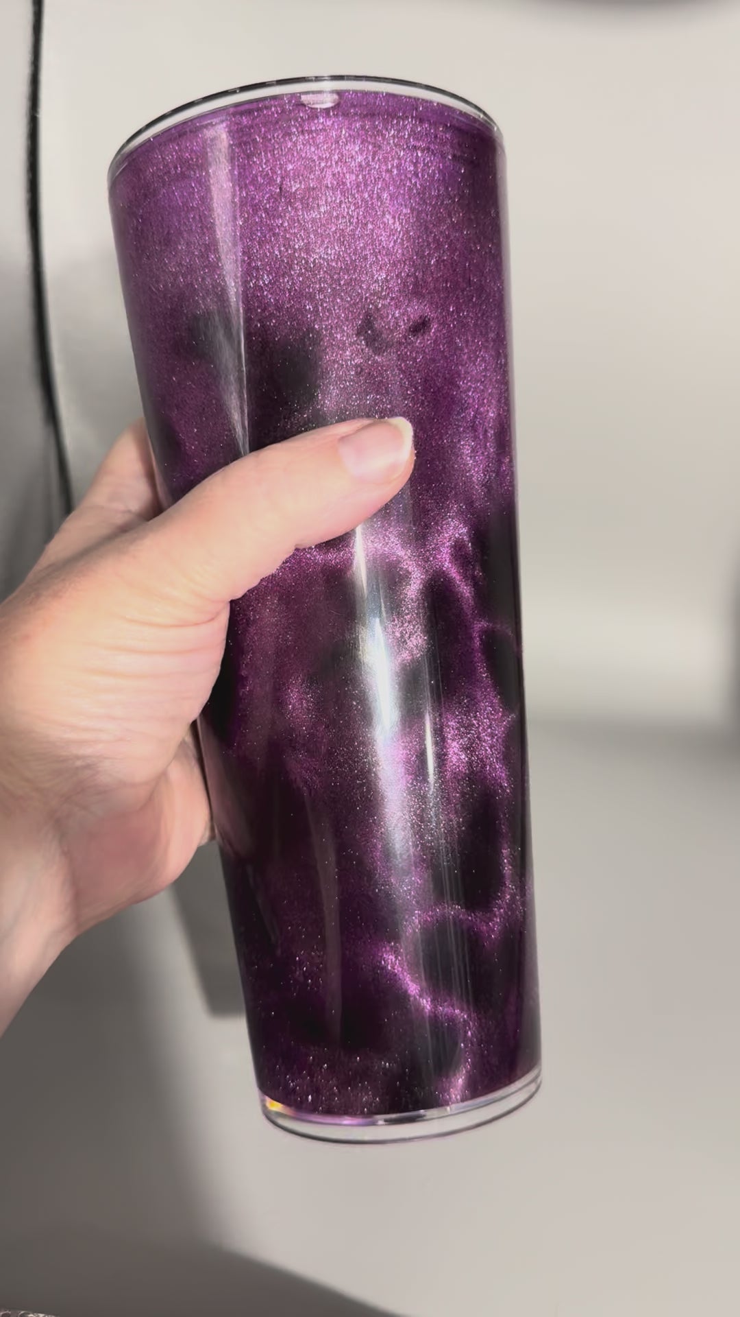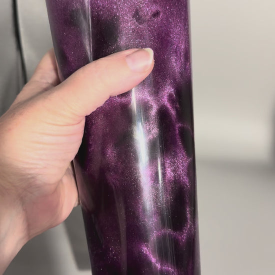 This handmade 24oz cat eye snowglobe cup features a rich purple magnetic shimmer that shifts beautifully in the light. Floating glitter creates a stunning snowglobe effect that moves with every shake, making each cup truly one of a kind.